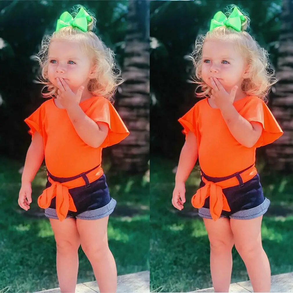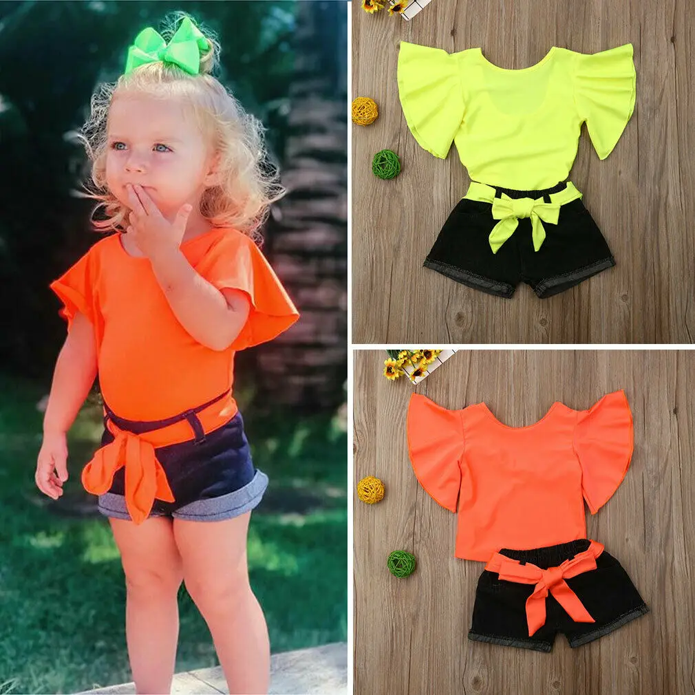 Good Offer of New 2019 Summer Toddler Girls Clothing Sets Floral Sleeve Ruffle Tops+Big Bow Jeans Shorts 2Pcs Inf